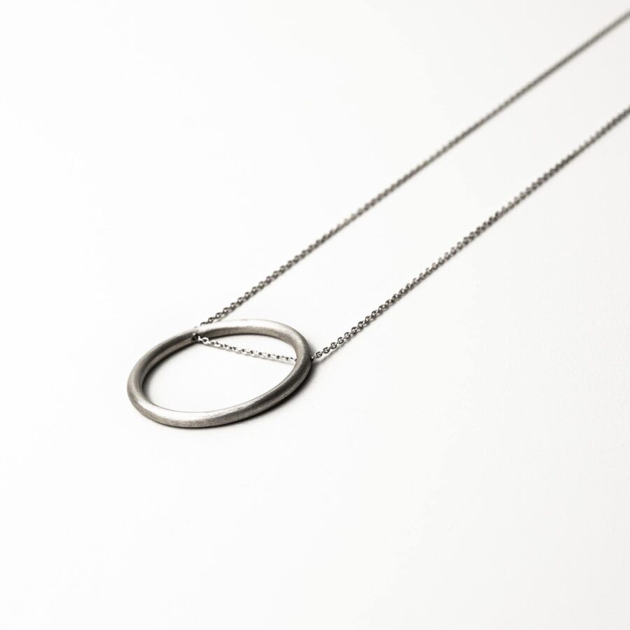 Kézzel készült, bordázott felületű ezüst medál nyers fekete turmalinnal, láncon.