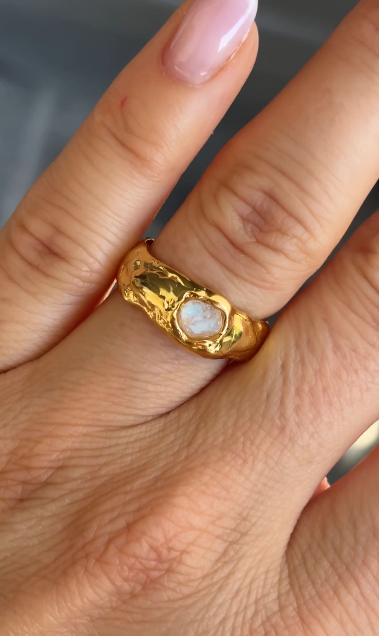 Fényes felületű, organikus gyűrű nyers holdkővel.